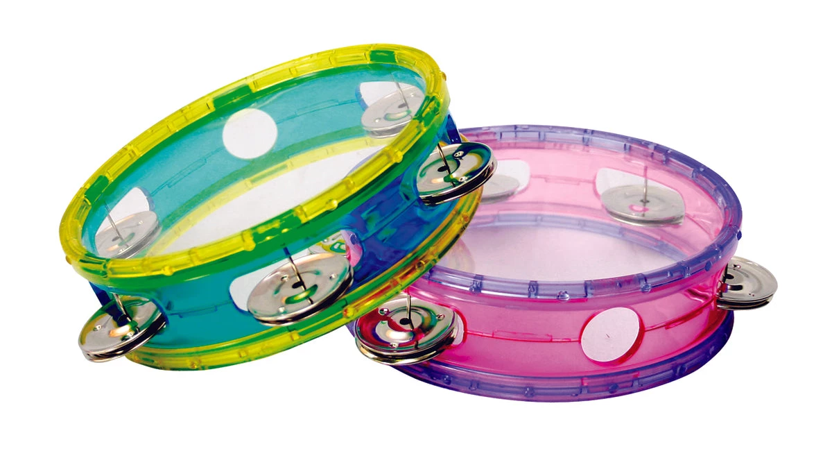 CPK branded 6 inch non-tunable tambourine with transparent plastic rim and clear plastic head. Has 5 pairs of jingles in single row. Available in transparent blue (yellow edges) and transparent pink (pink edges).