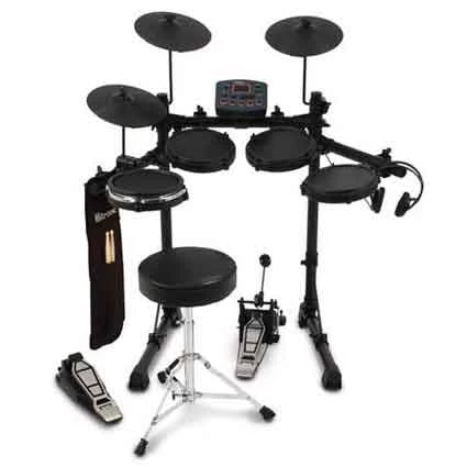 5 piece drum kit includes drum stool, headphones, drumsticks, stick bag and DC9V power supply.