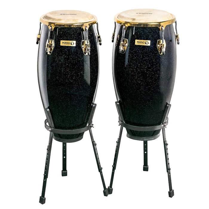 Hardwood shells, gold comfort curve rims, five gold 7.5 mm tuning lugs, gold side plates, tru skin cow heads, protective rubber base ring and height adjustable basket style stands. Gloss black sparkle.