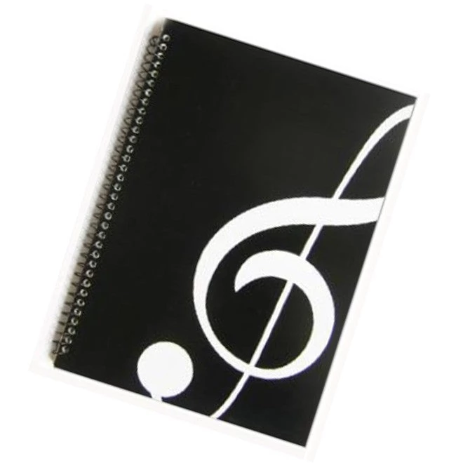 Music manuscript book with 13 staves on each page. Large G treble Clef design.
