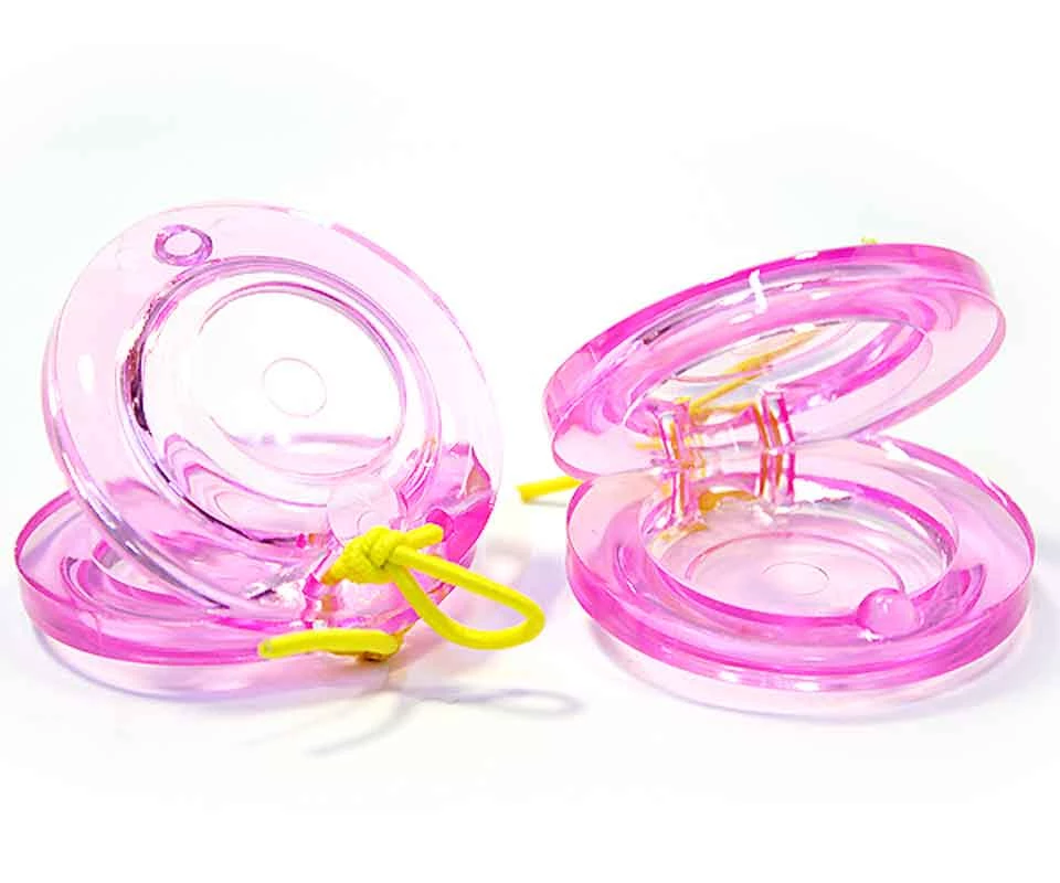 Pair of pink castanets for kids. The castanets make a clacking sound, and they’re small enough to fit comfortably into the hands of young kids.