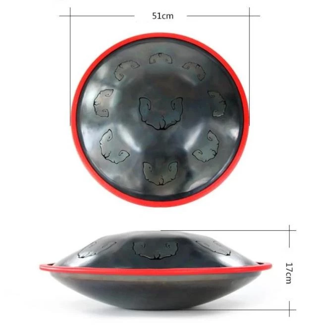 D Minor 9 notes hand pan (D3, A, Bb, C, D, E, F, G, A). Made of 100% Virgin Steel Alloy, 20 inches diameter and 6.7 inches high.