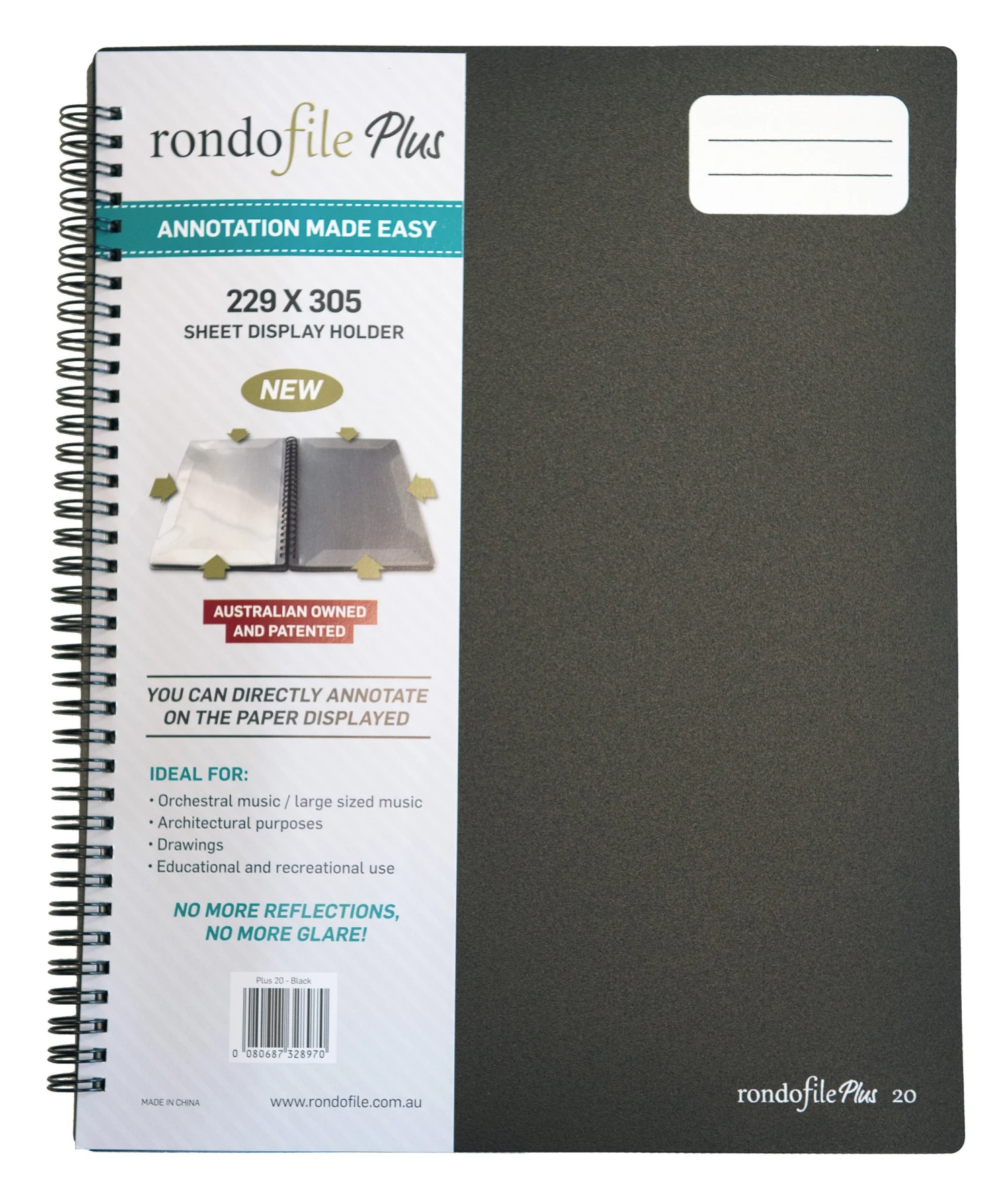 The Rondofile Plus 20 (20 sheets, black cover) is a specialised folder with larger than A4 sized Rondofile Sheets – 229mm x 305mm or 9 inch x 12 inch. The aim of this folder is to accommodate and fit the larger sized (American and Canadian) Orchestral and Band music scores and charts. Since it is slightly larger than A4, it can also accommodate A4 music sheets comfortably and snugly, which gives this folder an additional extra benefit. Australian owned and patented, Rondofile was designed with inputs from orchestral musicians. The open front tab allows you direct access to the majority of the page where you can write on it. 20 pages – 40 sides.