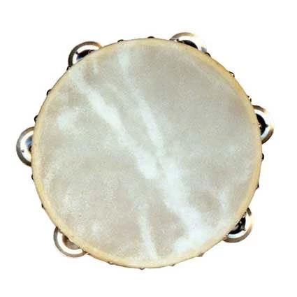 8 and a half inch calf skin tambourine with 6 pairs of jingles.
