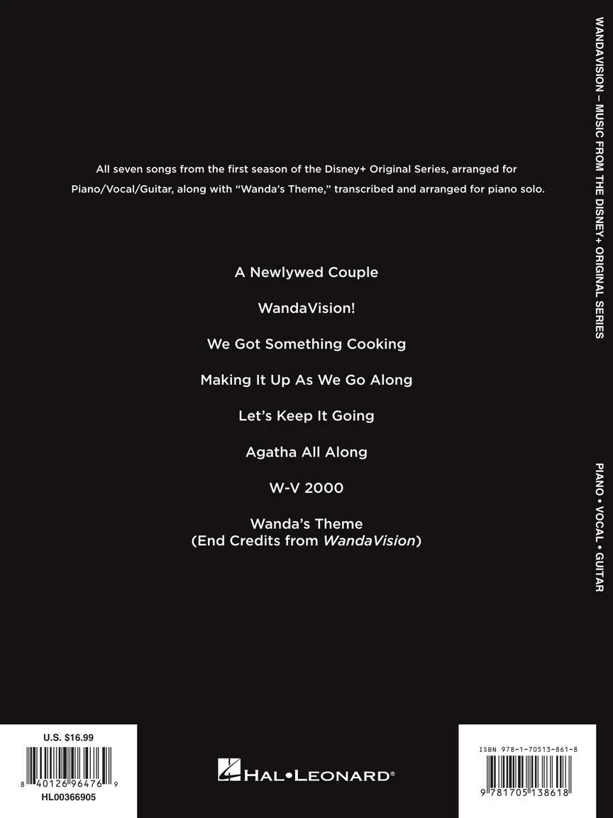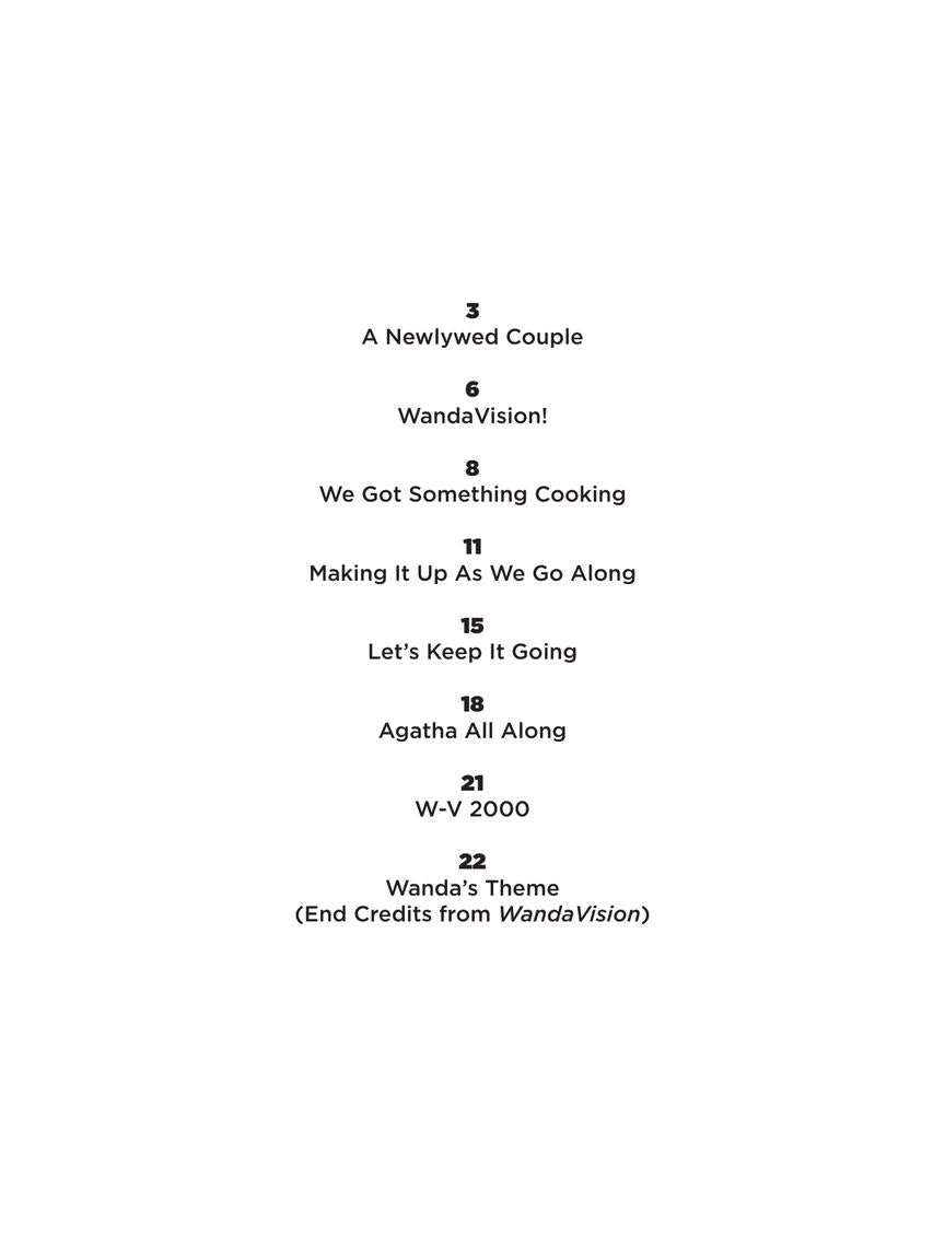 Eight songs from the Disney+ TV miniseries based on Marvel Comics characters are presented in this collection for piano, voice and guitar. It includes the series end credits theme by original score composer Christophe Beck, “Wanda’s Theme” plus seven individual episode themes by the talented Disney Frozen and Coco songwriting team of Kristen Anderson-Lopez and Robert Lopez: Agatha All Along • Let’s Keep It Going • Making It up As We Go Along • A Newlywed Couple • W-V 2000 • WandaVision! • and We Got Something Cookin’.