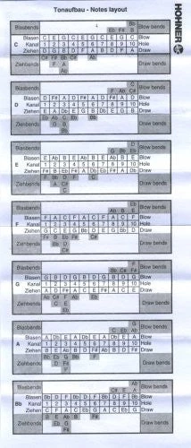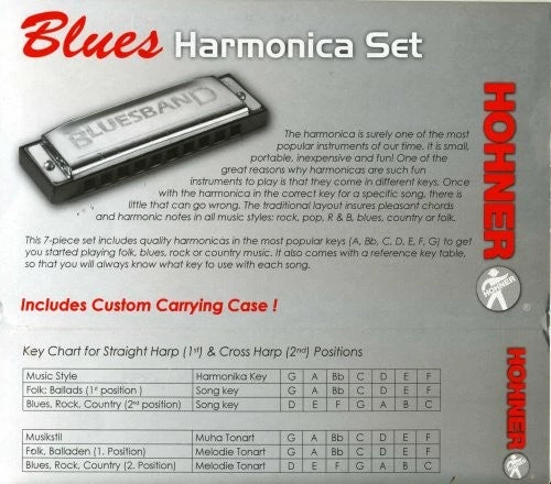 Harmonica set of the most popular keys of A Bb C D E F and G. It also comes with a reference key table, so that you will always know which key to use for the individual songs. Good for a beginner, especially one who has learned the basics on a C harmonica, and now wants to progress by practising in different keys at home. Makes a really good practice set and is presented in a zipped padded case. This is the Hohner Blues Band harmonica set and not to be confused with the cheaper Piedmont harmonica set.