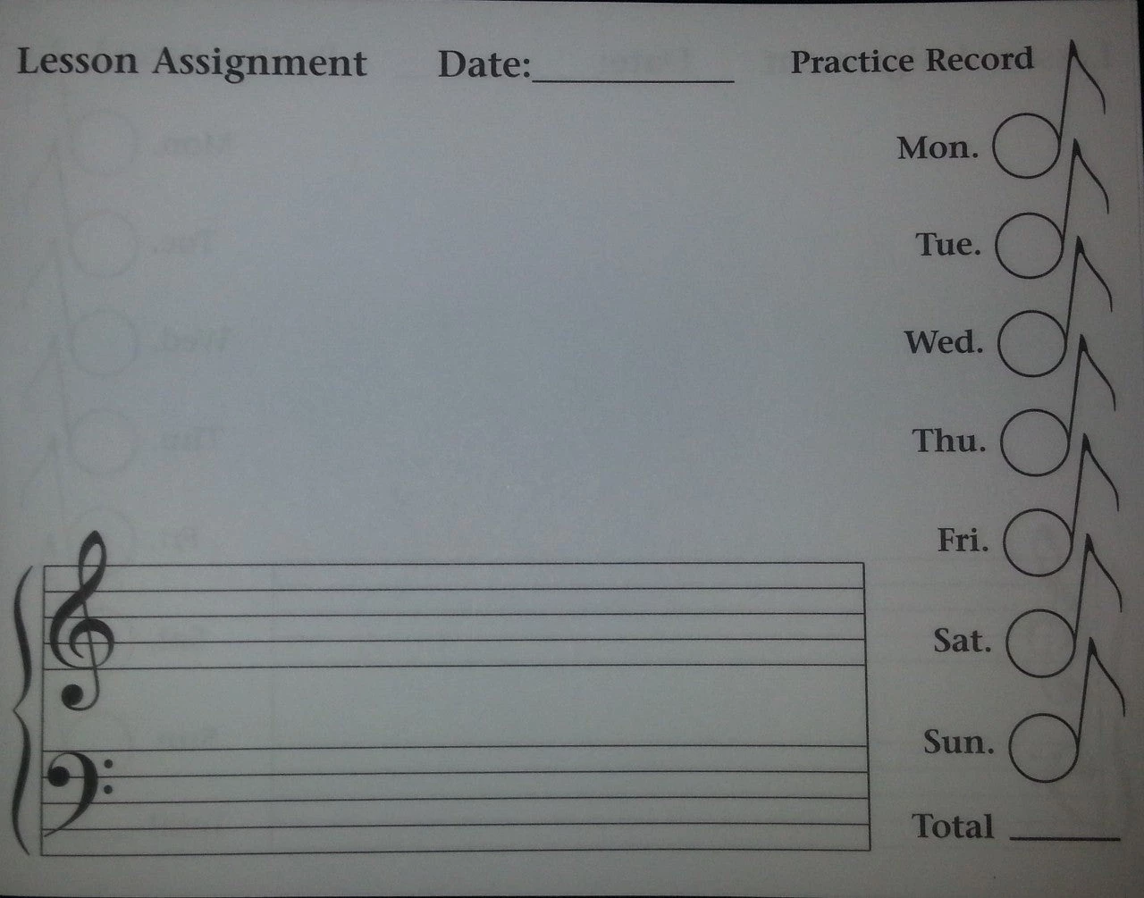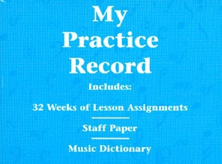 My Practice Record Book consists pages for writing 32 weeks of lesson assignments and a short grand stave manuscript for quick notations.
